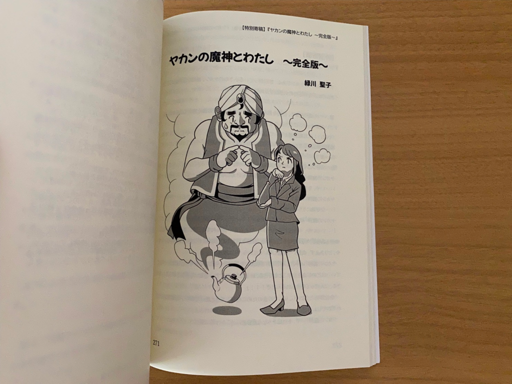 文章力向上オンラインサロン・放課後ライティング倶楽部が開催した「7日間ライティング合宿vol.2」の成果を冊子化した刊行物の一編「ヤカンの魔神とわたし〜完全版〜」の扉イラスト。